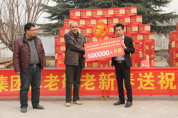 據(jù)了解,柳溝村共有家庭900余戶,60歲以上老人400余人。此次慰問(wèn)活動(dòng),經(jīng)典集團(tuán)贈(zèng)送府藏孔府家酒900箱、春聯(lián)580套總價(jià)值55萬(wàn)元,受到了柳溝村老人們的熱烈歡迎,15戶特困家庭還收到慰問(wèn)金500元。